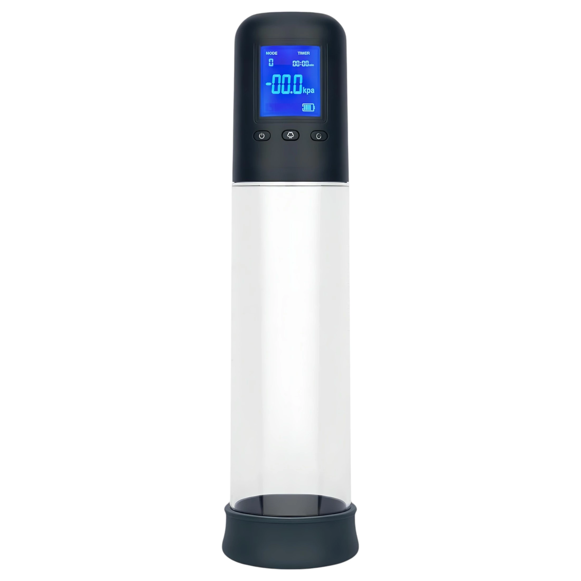 A digitális kijelző alatti három gomb segítségével állíthatod be a szívóerőt és a vibrációs módokat. A bal oldali (power) gomb hosszan lenyomva kapcsolja be és ki a pumpát, a középső (+) gombbal válthatsz a szívóerő módok között, míg a jobb oldali (-) gomb megszünteti a vákuumot.