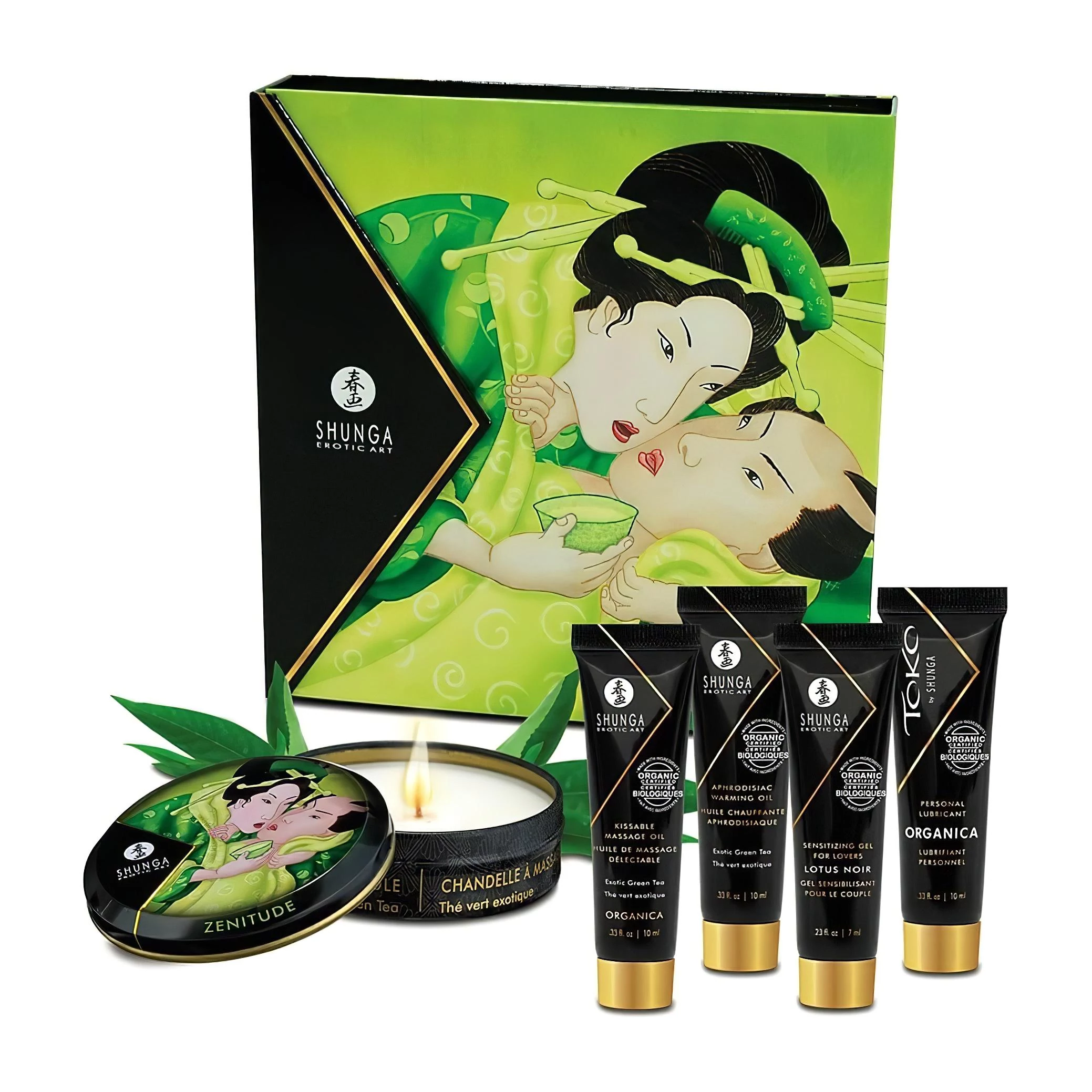 A Shunga Geisha ajándékcsomag egy exkluzív, 5 darabos mini készlet, amely tökéletes egy romantikus, érzéki találkozóhoz. A csomag tartalmaz masszázsolajokat, masszázsgyertyát, síkosítót és stimuláló gélt, mindegyiket luxus minőségben és zöld tea illattal. Ezek az érzéki termékek felébresztik az összes érzéket, és fokozzák a romantikus együttléteket. A termékek gyönyörű, kiváló minőségű dobozban érkeznek, így tökéletes ajándék is lehet.